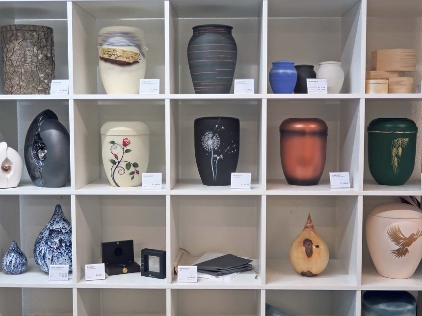 Zwei Dinge dürfen bei keinem Bestatter fehlen: Särge und Urnen. Erstere gibt es aus Pappel, Tanne oder Nussbaum. Sie werden in der Schweiz aus Schweizer Holz gefertigt, einzig die massiven Särge werden aus Italien importiert. Urnen sind aus Holz, Metall oder Keramik und auch in einer biologisch abbaubaren Version erhältlich.